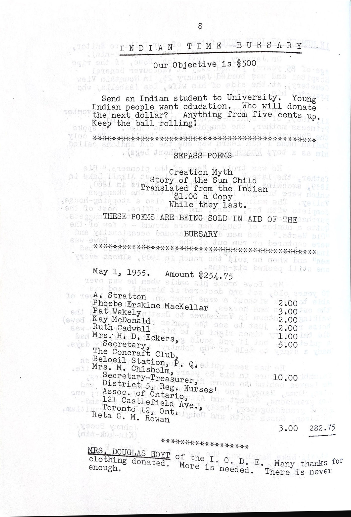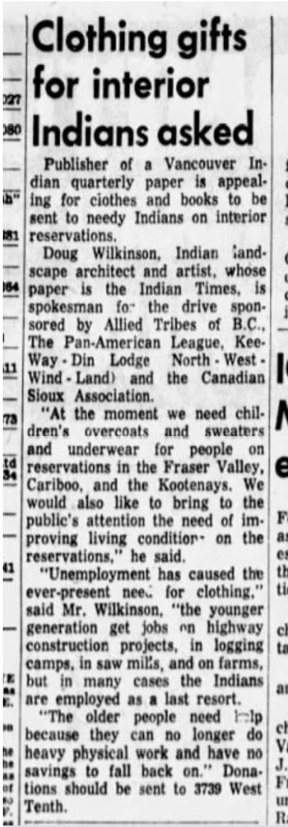 | This particular example of the “Indian Time Bursary” is from Vol. 2, No. 13, 1957 [?]. The note at the bottom, addressed to Mrs. Douglas Hoyt, I.O.D.E. reads, “Many thanks for the clothing donated. More is needed. There is never enough.” | “Clothing gifts for Interior Indians asked”, The Province (Vancouver), 23 Jan 1957, p. 39 |