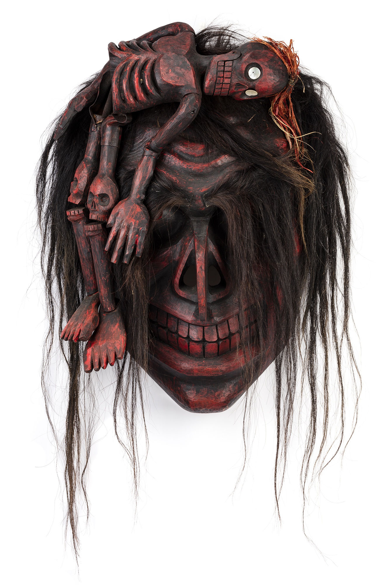The skeletal figure affixed atop the mask likely carries a dual significance. Articulated with leather and pins, its macabre form and humanoid skull-knees – which cleverly hinge at the jaws – are reminiscent of other puppet figures crafted by the artist. This may be understood as a reference to Kwakwa̱ka̱ʼwakw tradition of puppetry that is intricately linked to their ceremonies of potlatching and the hosting of feasts. It may also be interpreted as a grim tribute to the souls captured by Ba̱k’wa̱s; those deceived into accepting his treacherous offerings—rotten wood, maggots, snakes, or lizards masquerading as dried salmon. To accept this sinister gift from Ba̱k’wa̱s is to seal one's destiny, morphing the individual into a ghostly figure, eternally bound to Ba̱k’wa̱s.
