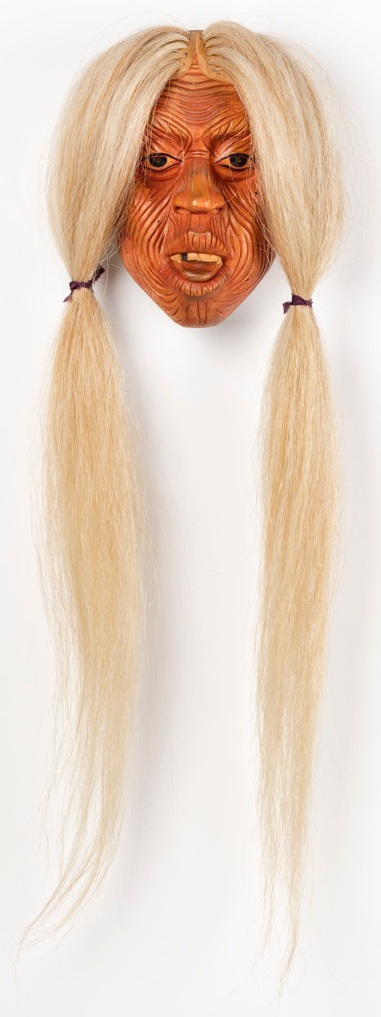 By contrast, Lot 88—which portrays Ba̱k’wa̱s, a man-eating spirit of the forest, embodies a complex and more intense artistic approach. Here, Dick’s mastery is evident in the detailed, layered features of the mask. The ferocious expression, the green-painted eyes that hint at the spirit’s forest home, and the disheveled hair all contribute to an atmosphere of menace. The use of leather to create the effect of decaying flesh adds a tactile dimension, enhancing the mask’s lifelike quality.