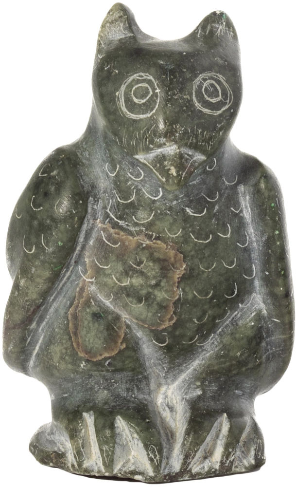 Like his cousin, Joe Talirunili, the owl is a subject that preoccupied Davidialuk's art throughout his career. As typical is both his graphics and sculptures, incised 'u' shapes on the...Like his cousin, Joe Talirunili, the owl is a subject that preoccupied Davidialuk's art throughout his career. As typical is both his graphics and sculptures, incised "u" shapes on the wings and breast mark its soft plumage. Likewise, in this delightful and domestic sized work, two sets of large concentric circles indicate the owl's eyes, which sit on its heart shaped face and peer out at the spectator like a hypnotic vortex.Provenance